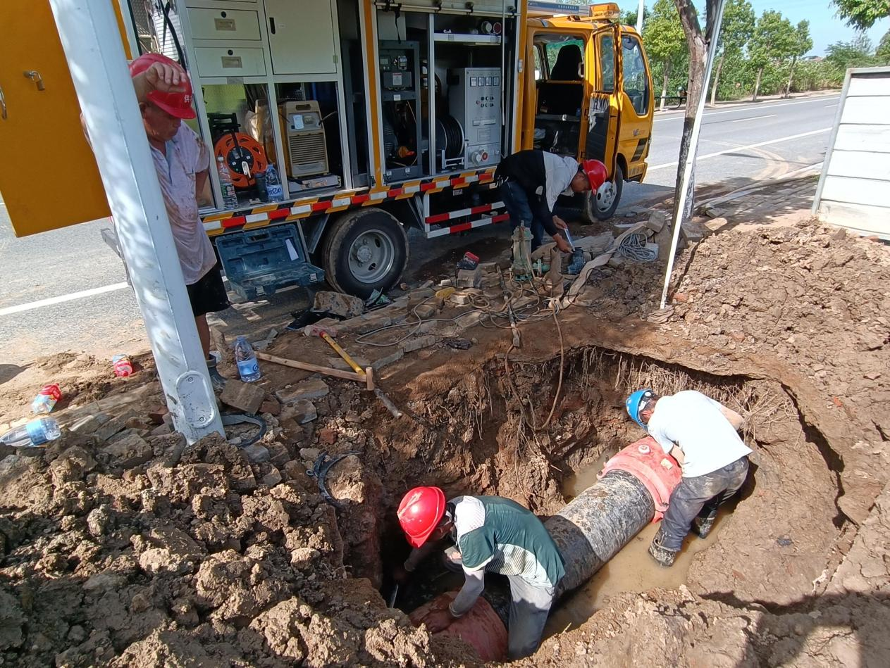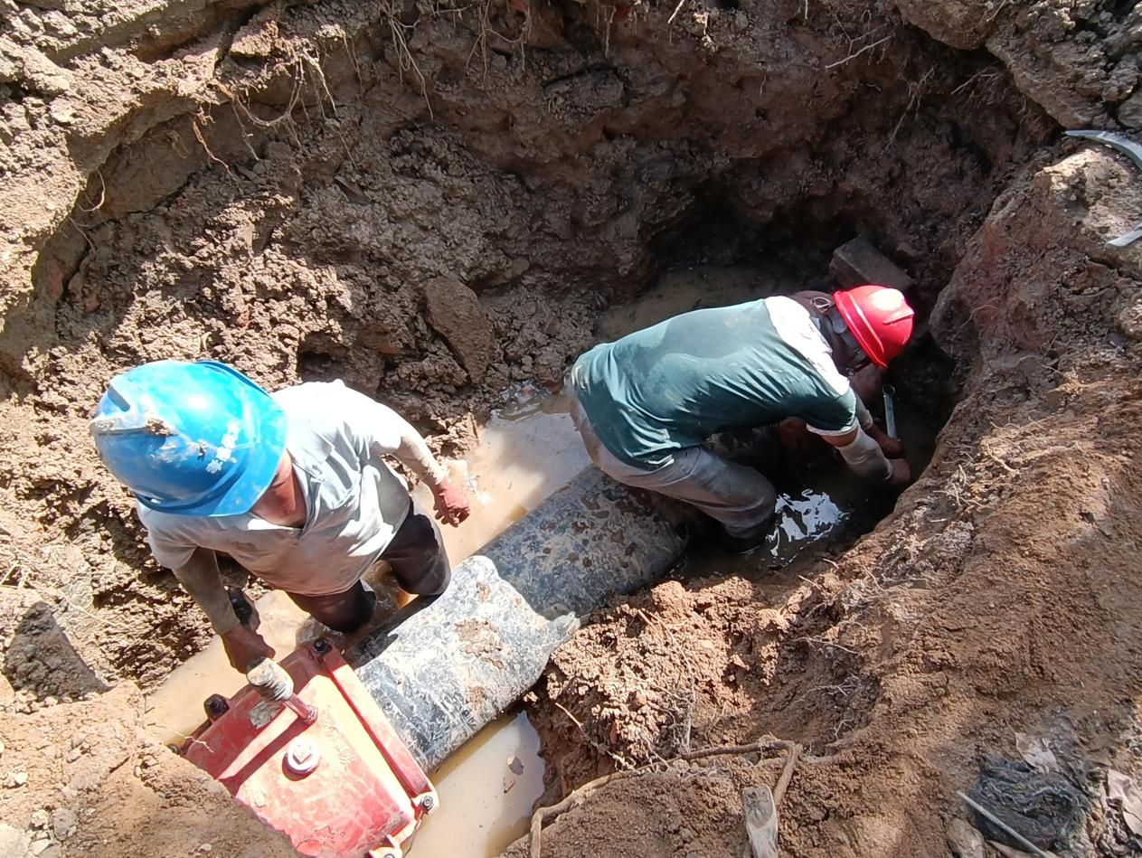 正值三伏天,天氣炎熱,氣溫高達(dá)40度。搶修人員絲毫不懼酷熱,他們在做好高溫防護(hù)后輪番上陣,有序推進(jìn)搶修工作。經(jīng)過(guò)挖掘、清理,作業(yè)坑成型,破損的DN400管道露出水面。隨后,搶修工作緊鑼密鼓展開(kāi)。經(jīng)過(guò)近8小時(shí)的奮戰(zhàn),于當(dāng)天下午4點(diǎn)完成了搶修任務(wù),從最大程度上減少了對(duì)附近居民及工商業(yè)用水造成的影響。