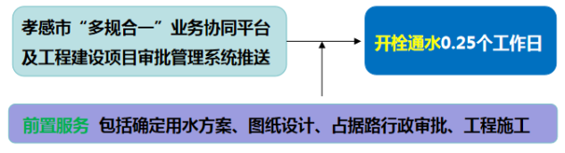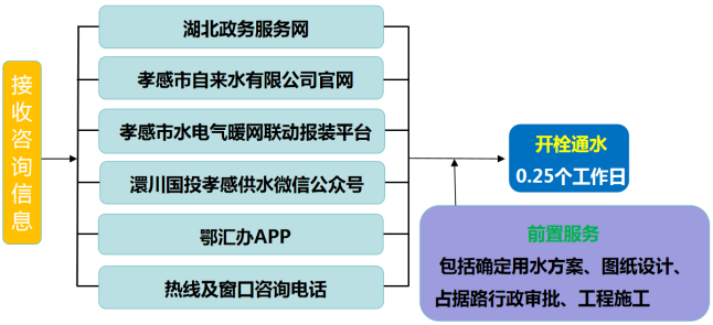 流程說(shuō)明:供水企業(yè)通過(guò)孝感市“多規(guī)合一”業(yè)務(wù)協(xié)同平臺(tái)及工程建設(shè)項(xiàng)目審批管理系統(tǒng)推送獲取項(xiàng)目建設(shè)信息后主動(dòng)對(duì)接,先行開展確定用水方案、圖紙?jiān)O(shè)計(jì)、工程施工等服務(wù),辦理用水工程涉及的占道、掘路、占用綠地、伐移樹木等相關(guān)行政審批手續(xù),提前完成外線工程實(shí)施,為客戶提供“無(wú)感免申請(qǐng)”服務(wù)??蛻粜枰盟畷r(shí),0.25個(gè)工作日內(nèi)開栓通水。