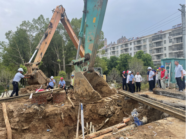 17日清晨開(kāi)始,50余名各方人員和10余臺(tái)工程機(jī)械設(shè)備繼續(xù)增援、先后到場(chǎng),現(xiàn)場(chǎng)邊排水邊開(kāi)挖,并按照多套搶修方案分頭準(zhǔn)備。