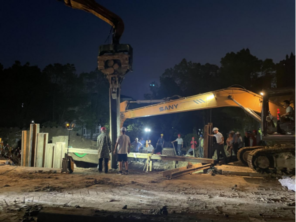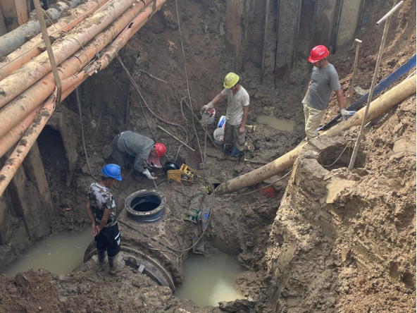 晚上9點(diǎn),公司第一時(shí)間派出10余名搶修人員迅速到場(chǎng)關(guān)閘止水,三水廠(chǎng)暫停供水。與此同時(shí),技術(shù)人員、施工人員和設(shè)備設(shè)施“跑步前進(jìn)”、同步到場(chǎng),對(duì)破損溢水點(diǎn)進(jìn)行邊開(kāi)挖、邊診斷。由于情況復(fù)雜,晚上24點(diǎn),3臺(tái)大型挖機(jī)、樁機(jī)進(jìn)場(chǎng),20余人到場(chǎng)增援,清理作業(yè)面。市政府組織市住建局、澴川國(guó)投、供電公司、燃?xì)夤炯纯探M成技術(shù)專(zhuān)班,會(huì)同公司技術(shù)人員和一線(xiàn)工人現(xiàn)場(chǎng)制定搶修方案。