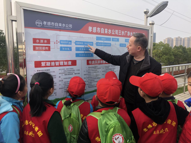 “我們城區(qū)的生活用水來自漢江,大家看看現(xiàn)在水池中水的顏色,我們接著往下參觀……”在公司三水廠工作人員的帶領(lǐng)和介紹下,小記者們看到了處理前的原水。由于他們大多是第一次參觀自來水廠,對每一步工序、每一處管道、每一種儀器都充滿好奇。他們有的在不停追問,仔細(xì)探究水處理過程中的每一點細(xì)微變化;有的認(rèn)真做著記錄,若有所思,與家長和同學(xué)進(jìn)行探討。