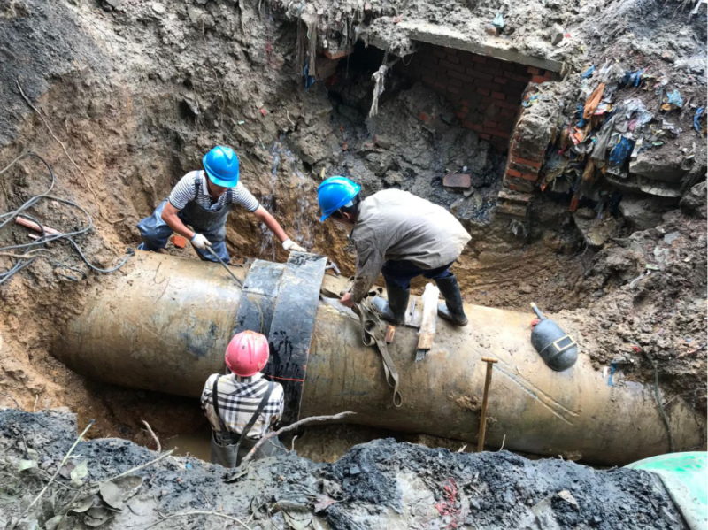 18日下午6點(diǎn),DN800管道漏點(diǎn)終被挖出,原因是兩根水泥管道連接處經(jīng)過(guò)天長(zhǎng)日久的熱脹冷縮而發(fā)生漏水??紤]到停水作業(yè)將會(huì)影響用戶(hù)的正常需求,在管道挖出后,搶修人員發(fā)揮分工協(xié)作的高效作風(fēng),一組進(jìn)行人工清理操作坑底和管上的淤泥,一組負(fù)責(zé)備料,一組關(guān)閘調(diào)水。下午7點(diǎn),材料到位,操作坑內(nèi)5名維修人員加緊手中動(dòng)作,一刻不停進(jìn)行管道清理、搶修節(jié)包裹、擰螺栓……19日凌晨,經(jīng)過(guò)14個(gè)小時(shí)的緊急搶修,DN800供水管道維修工作順利完成,主城區(qū)全面恢復(fù)正常供水。