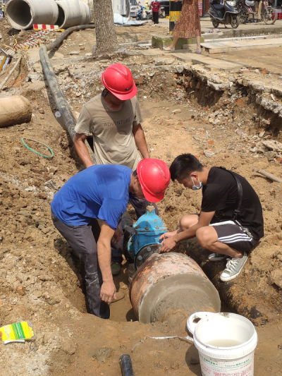 8月19日上午室外溫度已達(dá)35℃,管道工們克服高溫,奮力搶修,終于在下午5點(diǎn)前修好了供水管道,解決了群眾用水問題。